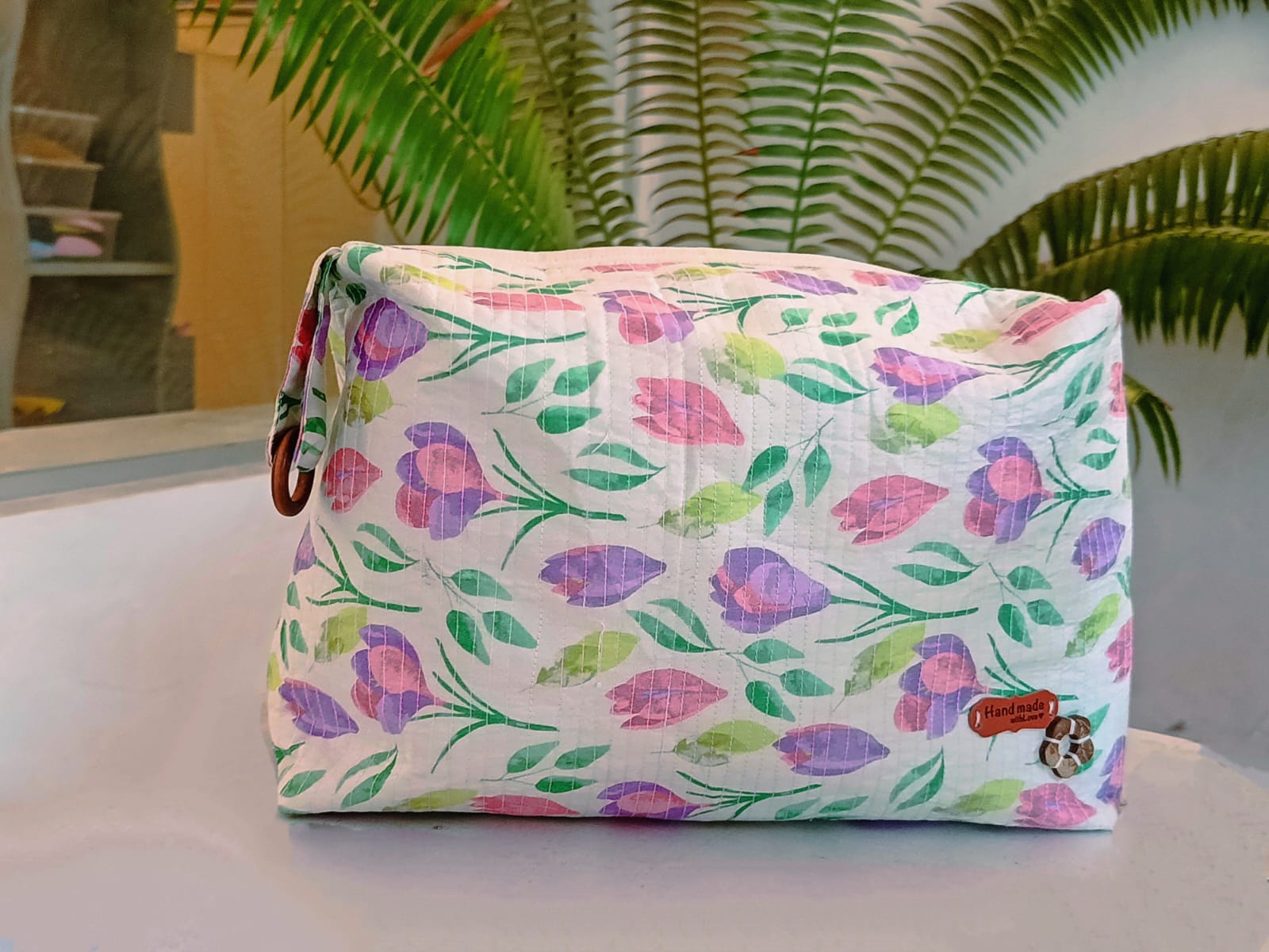 Brighten up your everyday essentials with this beautifully handcrafted multipurpose pouch. Made from durable quilted fabric, this pouch features a charming hand-printed floral design with shades of pink, purple, and green on a white background bringing a fresh, nature-inspired aesthetic to your accessories.
